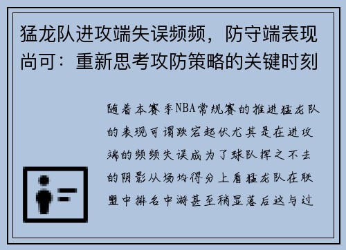 猛龙队进攻端失误频频,防守端表现尚可:重新思考攻防策略的关键时刻