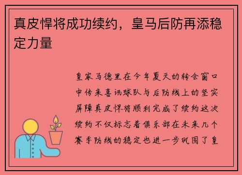 皇家马德里在今年夏天的转会窗口中传来喜讯,球队与后防线上的坚实屏障——“真皮悍将”顺利完成了续约。这次续约不仅标志着俱乐部在未来几个赛季防线的稳定,也进一步巩固了皇马在国内外战场上的竞争力。随着欧洲足坛竞争愈发激烈,皇马能够保住这样一位经验丰富且实力出众的后防核心,无疑是一大利好消息。